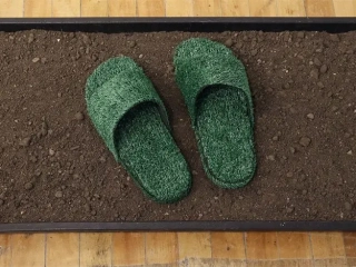 Grounded (Touch Glass) by Jeffrey van LeeuwenCardboard, grass carpet, adhesive, plastic boot tray, soil